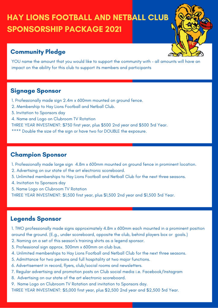 You have an opportunity to boost your profitability by partnering with our club and its members through one of our attractive advertising and marketing plans. Hay Lions Football and Netball Club needs your support to help fund local football and netball competitions for kids and teenagers through to adults enabling them to play sport in a club and become healthy, positive and confident members of the greater community.